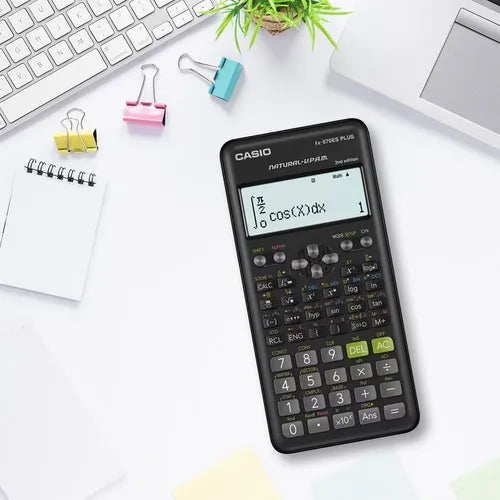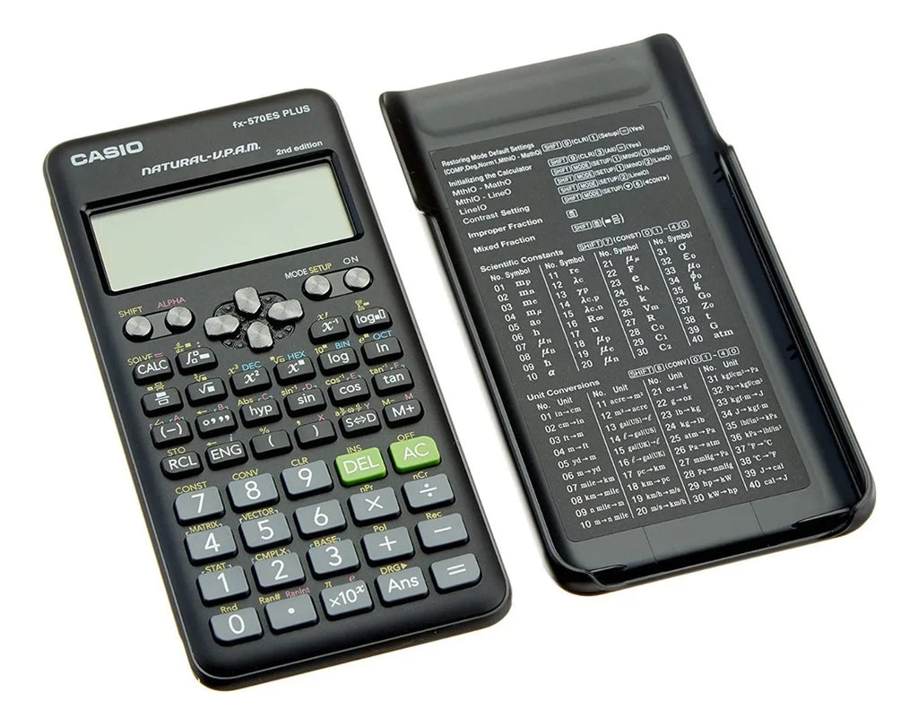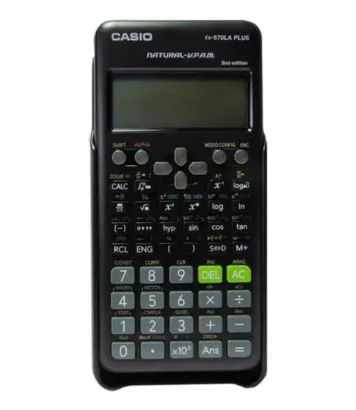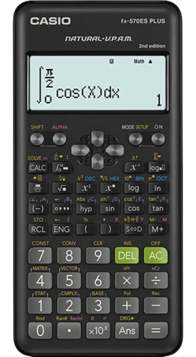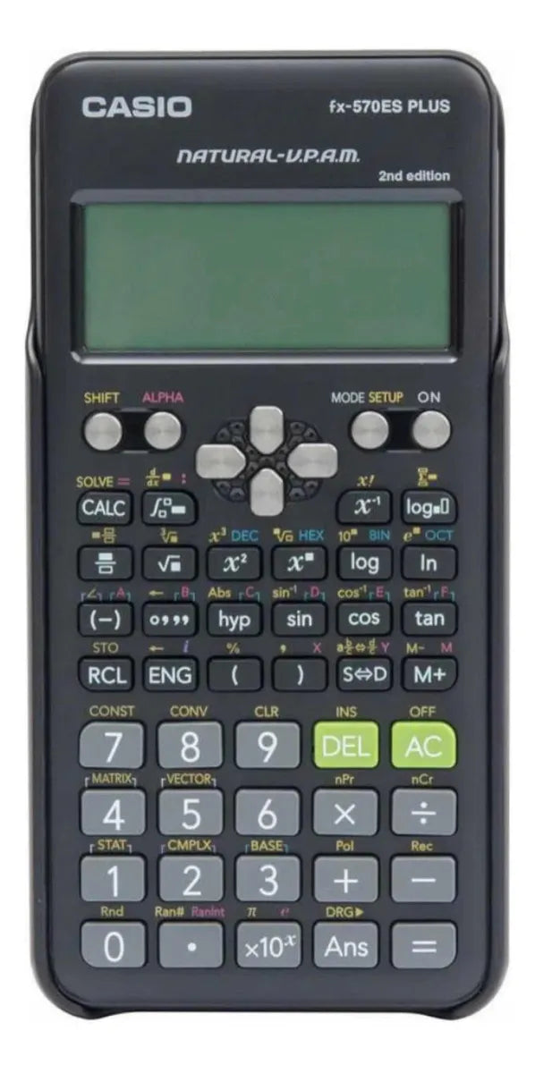 CALCULADORA ORIGINAL CASIO MODELO FX-570LA PLUS 2nd EDICION Especificaciones detalladas: Respuestas múltiples 24 niveles de paréntesis Memoria variable (7) tecla STO/RCL 417 funciones Pantalla: "pantalla natural de libro de texto" con sistema V.P.A.M. Dimensiones (Alt. x Anch. x Prof.): 162,0 x 80,0 x 13,8 mm Peso: 100 g Funciones científicas básicas: nuevo modo de introducción de fracciones mejora del modo de ecuaciones números enteros aleatorios Funciones trigonométricas y trigonométricas inversas Funciones hiperbólicas e hiperbólicas inversas x2/ xy / xv - cálculos de (potencias / potencias de raíces) cálculos logarítmicos (log, ln) 10x, ex - cálculos (exponenciales) v - cálculos de (raíces) x-1 - cálculos (inversos) Combinatorias y permutación Número aleatorio, ejecución Conversión de coordenadas polares en coordenadas rectangulares y viceversa Fracción (dos modos) Conversión de sexagesimal a decimal y viceversa Calcula en grados, gradianes y radianes ¿-tecla, e-tecla y %-tecla Función SCI/FIX/ENG Estadísticas: Estadísticas basadas en listas Estadísticas de 1 variable Desviación estándar Estadísticas de 2 variables (regresiones) Lineal Exponencial Exponencial ab Logarítmica Potencia Inversa Cuadrática Resolver / Calcular Cálculo integral numérico Cálculo diferencial numérico ¿() - función cálculo de números complejos a+bi/ rÐq Cálculo en base n Cálculo lógico Ecuación Ecuación simultánea Ecuación polinómica Matriz Determinante Matriz inversa Matriz traspuesta Vector producto interno Producto externo Constante física Conversión métrica Entrada natural Fracción Raíz Potencia Paréntesis Número absoluto Diferenciación / integración numérica / Suma Entrada no natural (como los modelos MS) Salida en forma v Salida en p forma Tabla de función